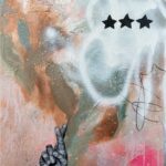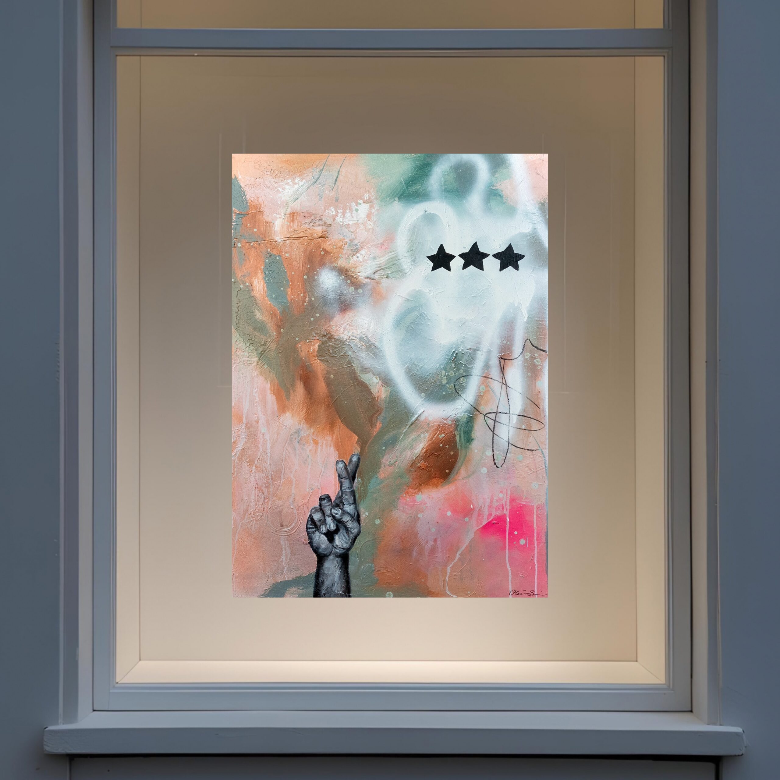 Abstract painting on canvas. Made with acrylic paint, oil paint, spray paint, and charcoal. The painting comes in a wooden frame. It is signed and dated on the back and comes ready to hang. The artwork is coated with an acrylic finishing spray for a long-lasting, scratch-resistant protective surface.
