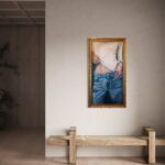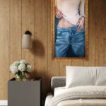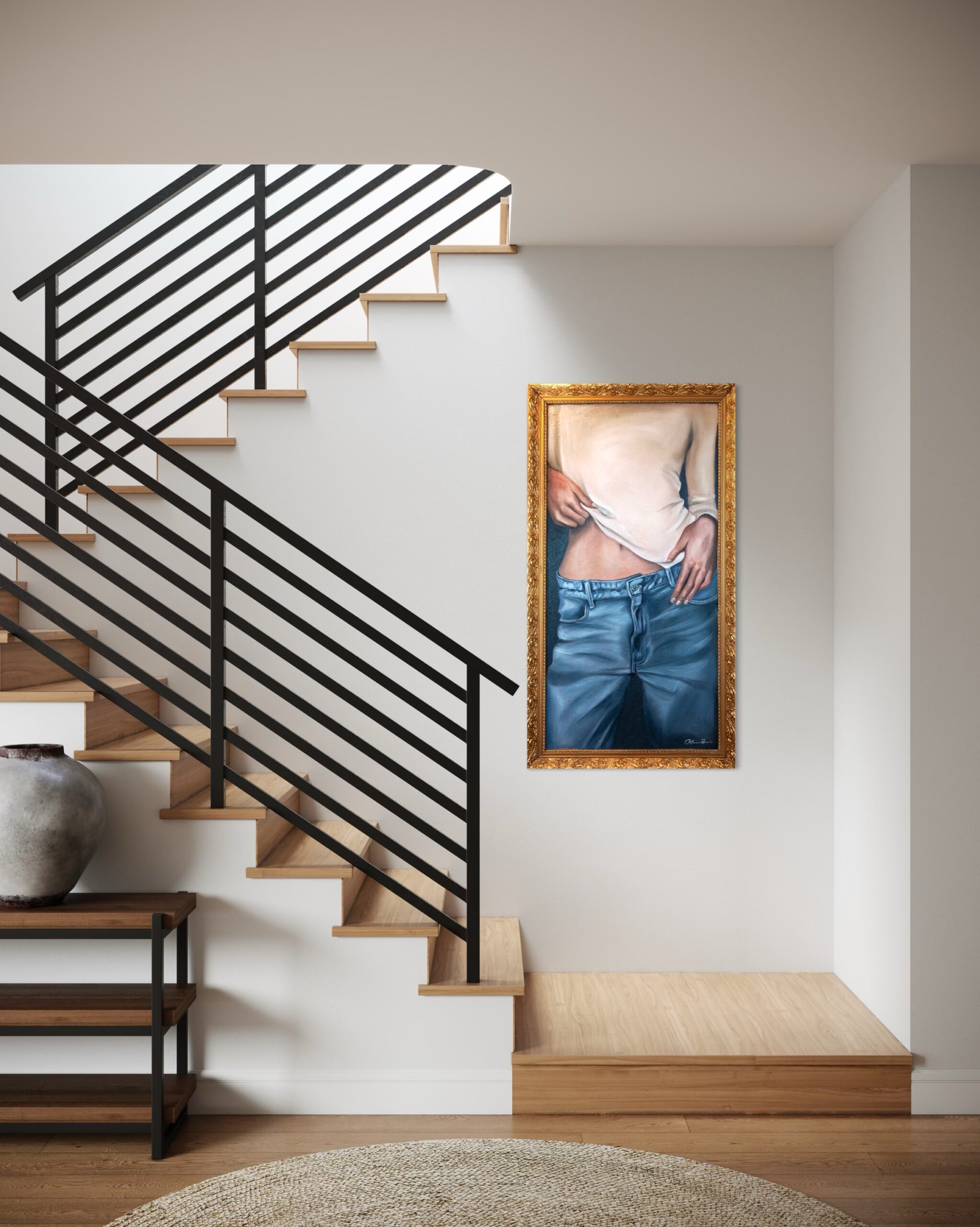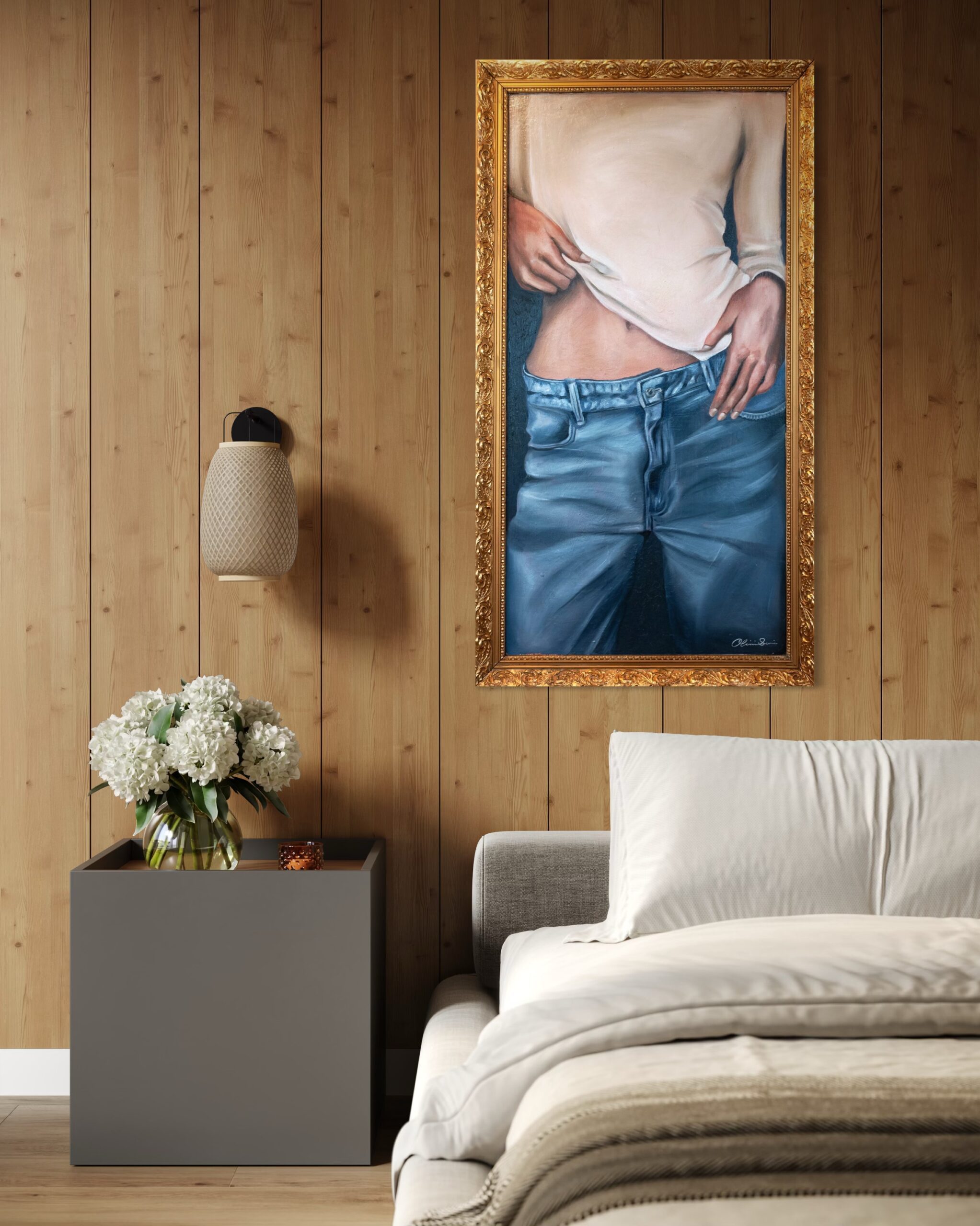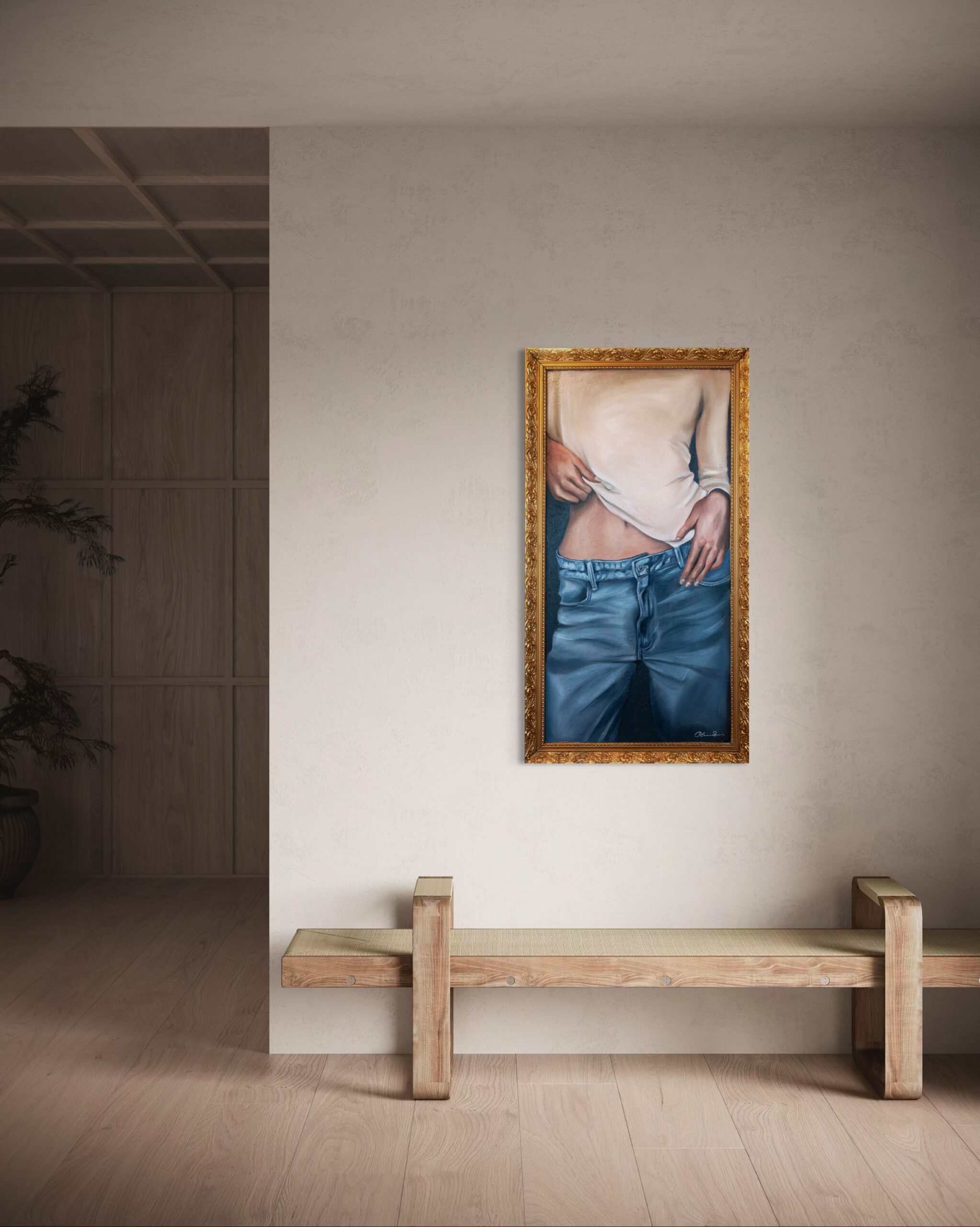 The piece portrays a woman in her favorite clothes, captured in a moment where she feels confident and authentic. The painting comes with a golden frame. It is signed and dated on the back and comes wired and ready to hang. The artwork is coated with an acrylic finishing spray for a long-lasting, scratch-resistant protective surface.