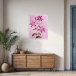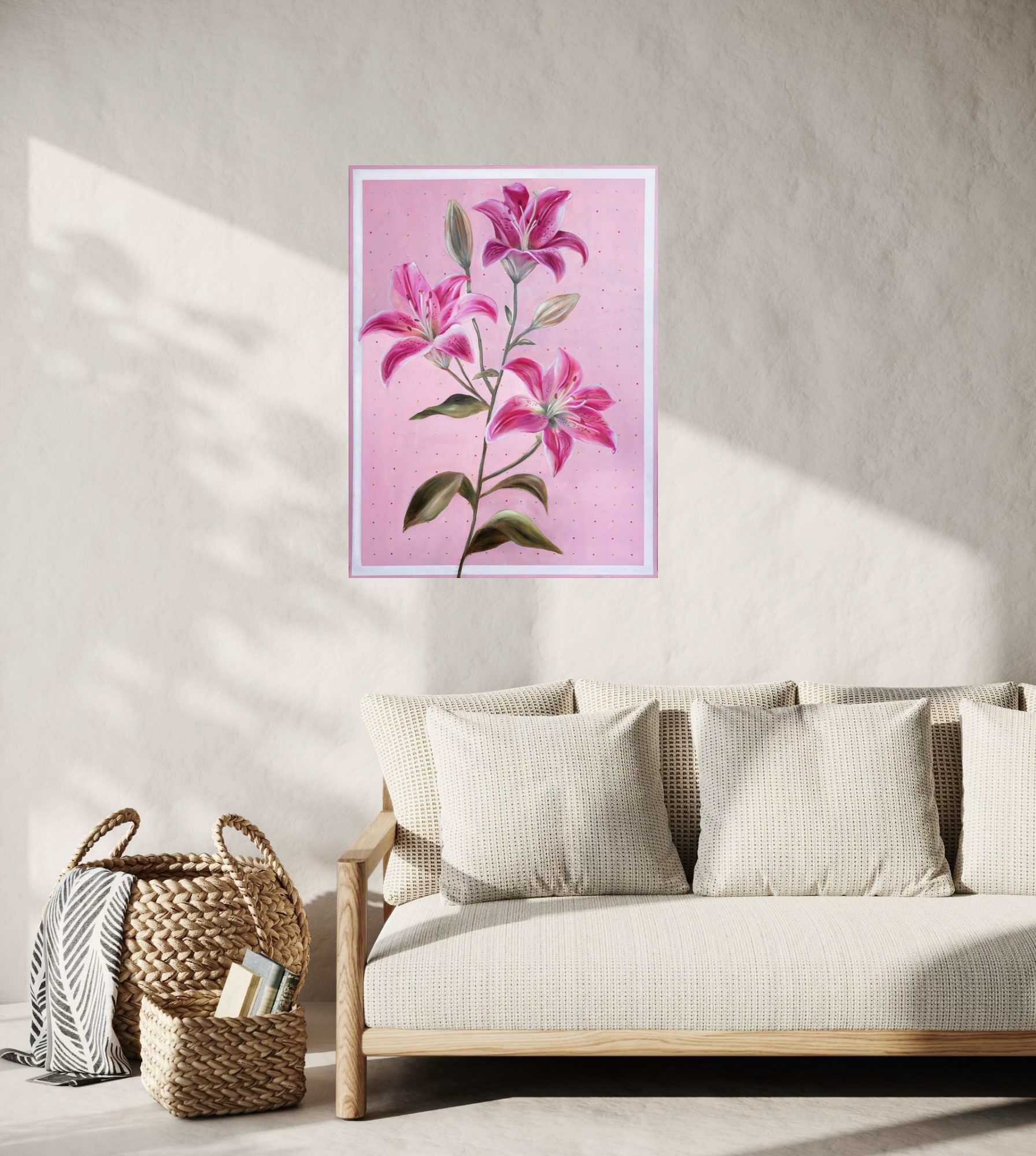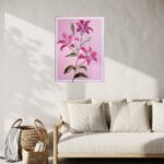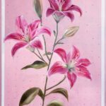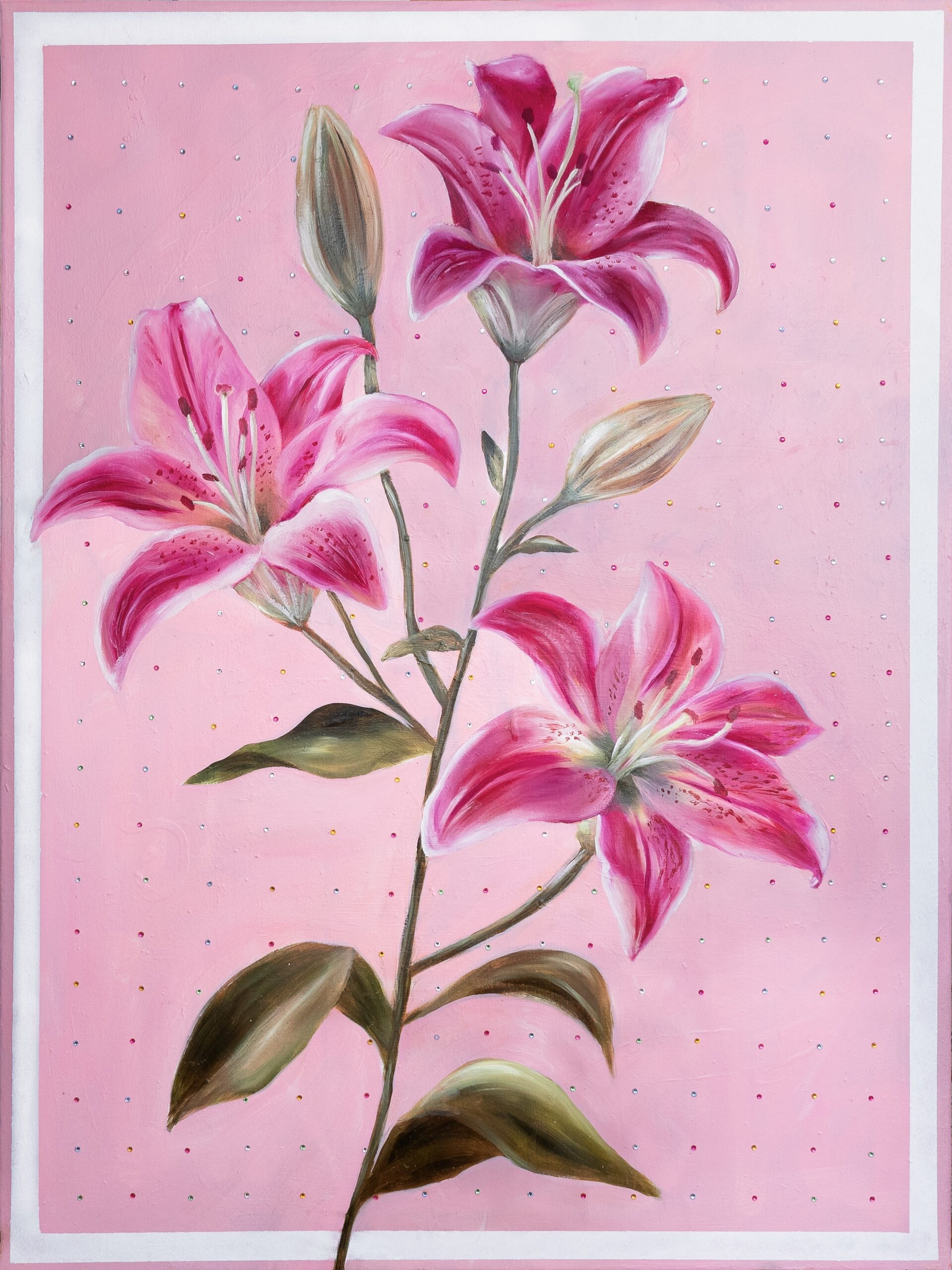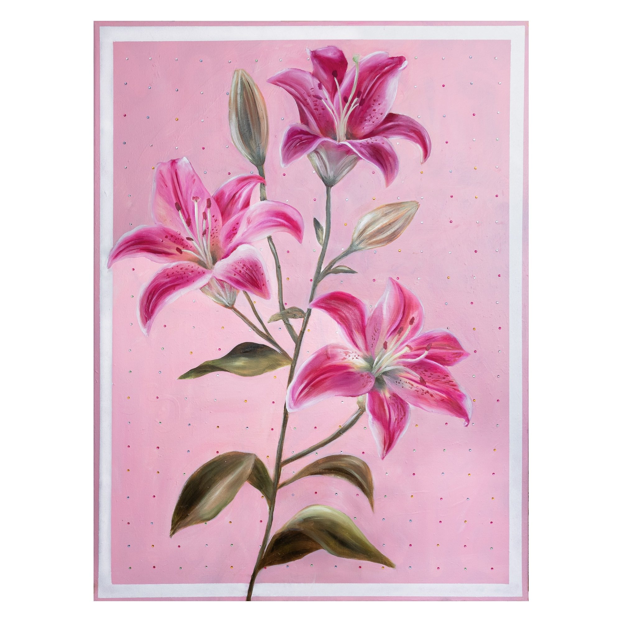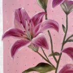 Lilies on a pink diamond background. It is signed and dated on the back and comes wired and ready to hang. The artwork is coated with an acrylic finishing spray for a long-lasting, scratch-resistant protective surface.