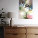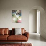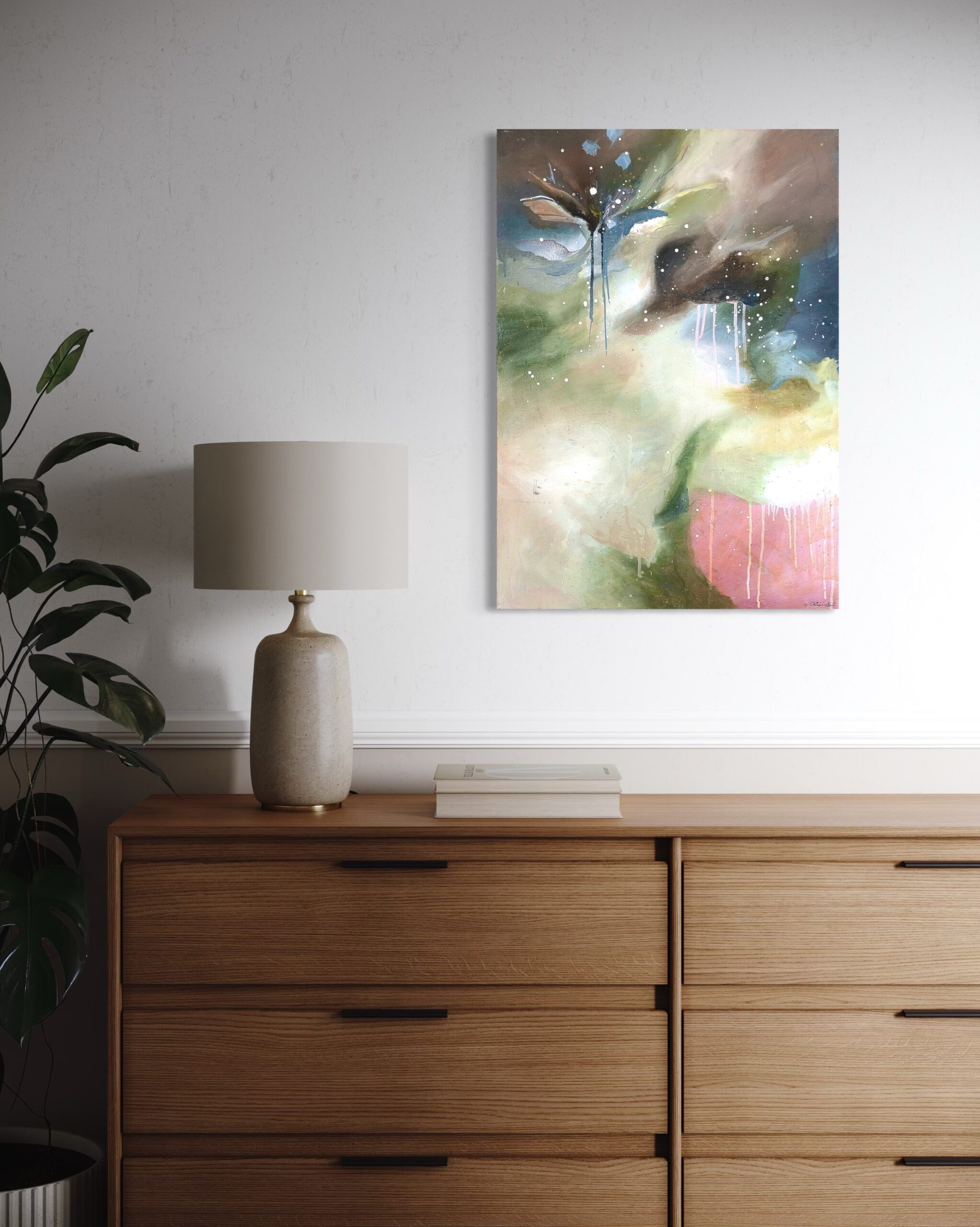 The painting comes with a handmade wooden frame in the color oak. It is signed and dated on the back and comes wired and ready to hang. A dreamy landscape featuring a soft, magical waterfall, surrounded by calm tones. The artwork is coated with an acrylic finishing spray for a long-lasting, scratch-resistant protective surface.