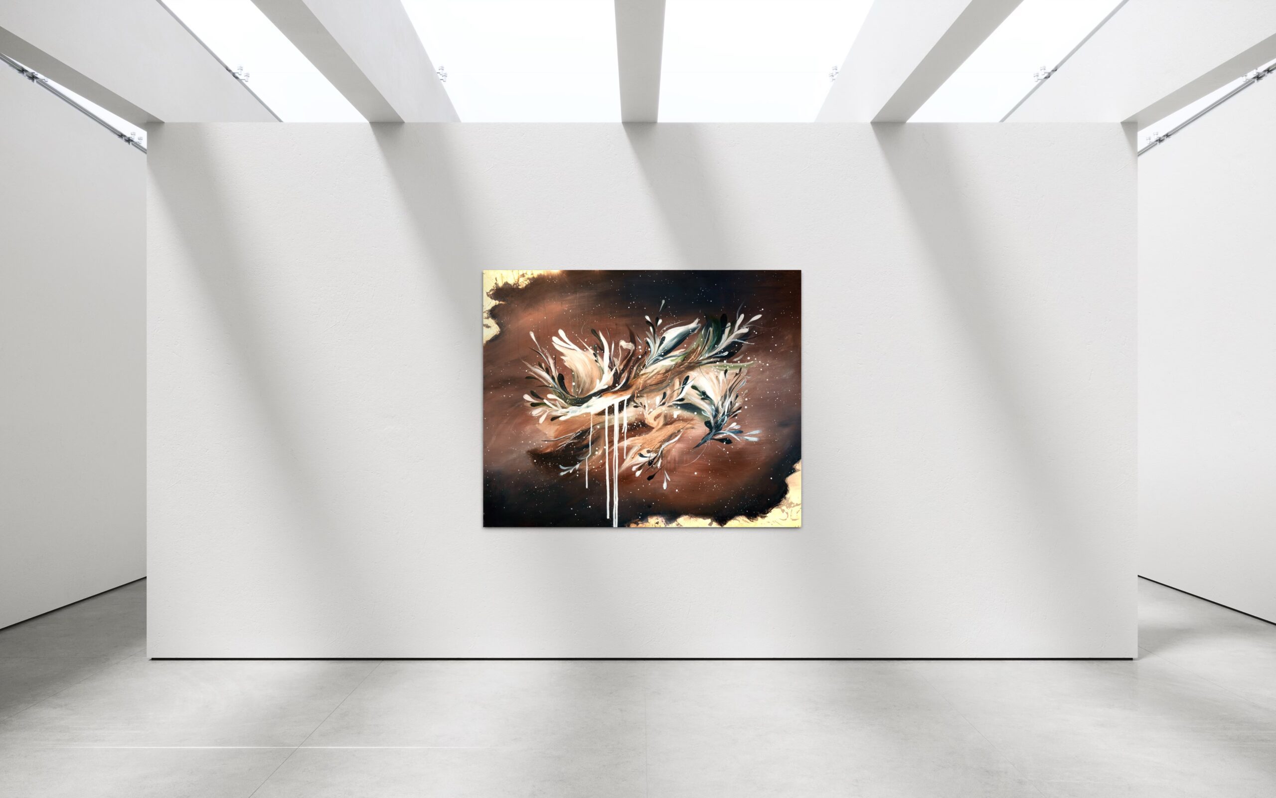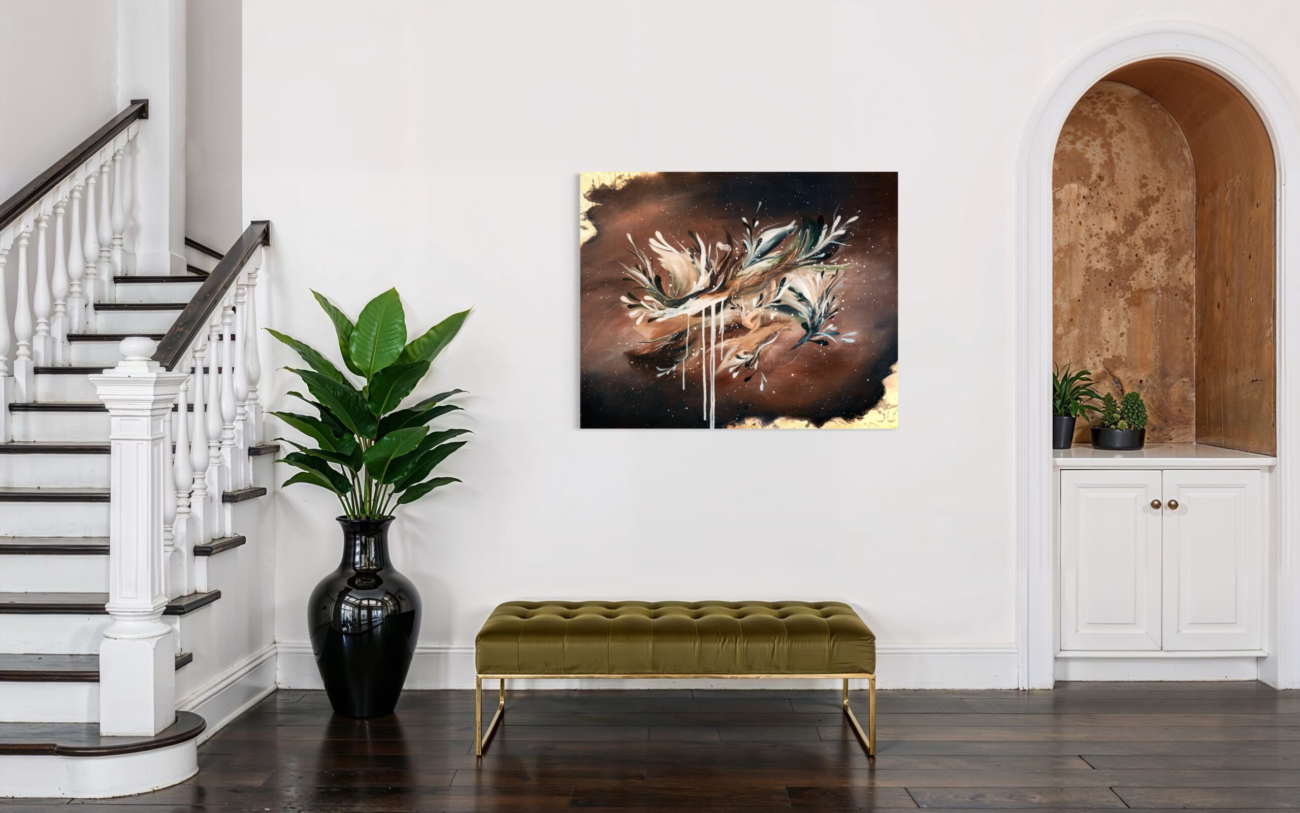 Dark abstract artwork depicting growth, with gold leaf “frames” around the edges. The painting comes with a handmade wooden frame in the color oak. It is signed and dated on the back and comes wired and ready to hang. The artwork is coated with an acrylic finishing spray for a long-lasting, scratch-resistant protective surface.