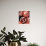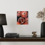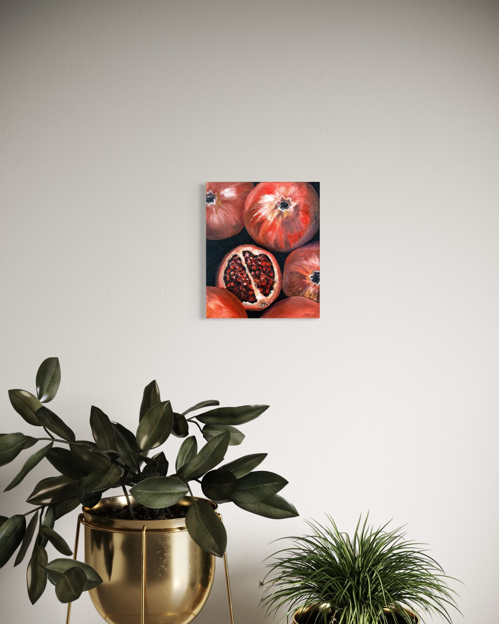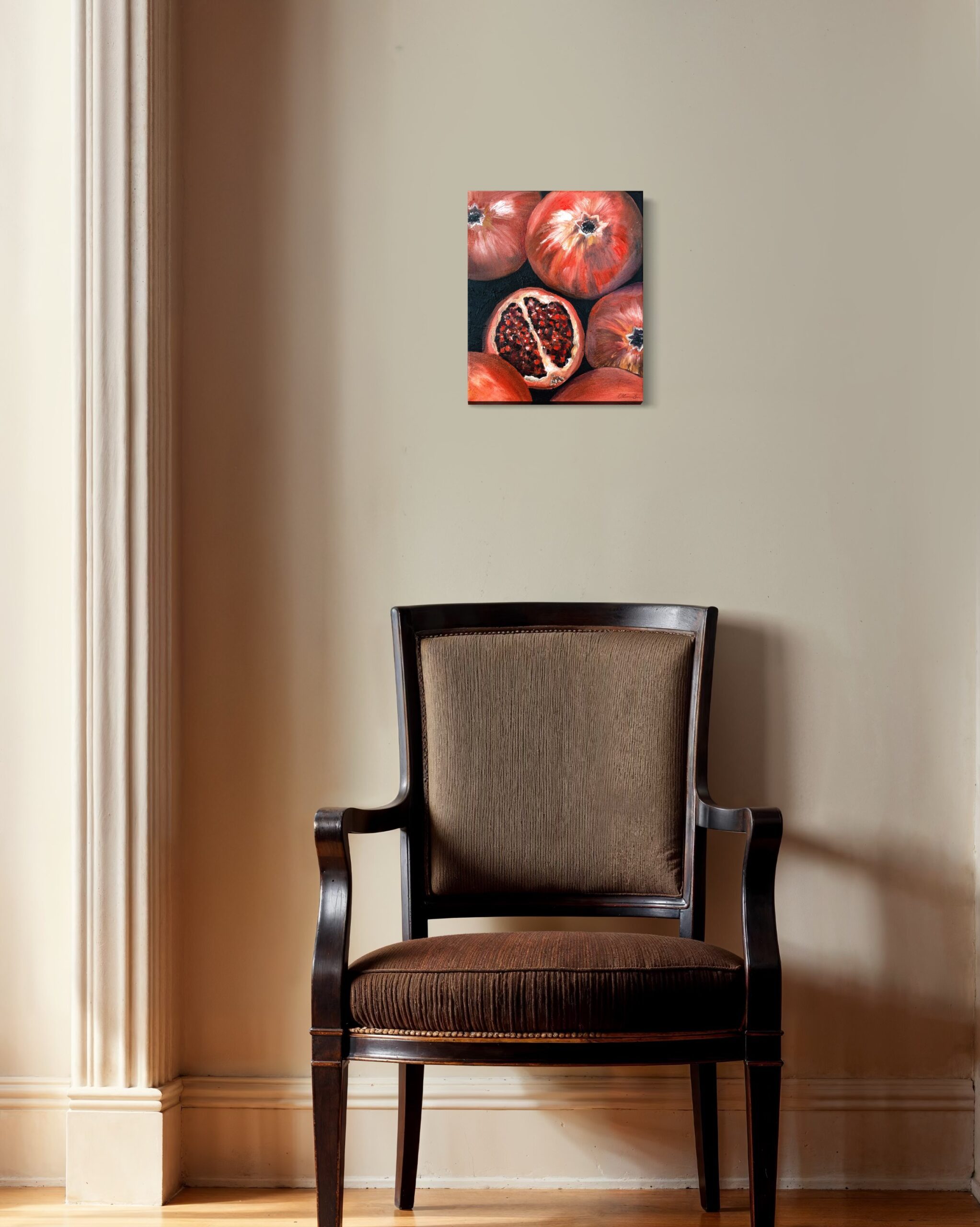 The pomegranate symbolizes richness and depth, a natural treasure with a calm yet captivating presence. The painting comes with a handmade wooden frame in the color oak. It is signed and dated on the back and comes wired and ready to hang. The artwork is coated with an acrylic finishing spray for a long-lasting, scratch-resistant protective surface.