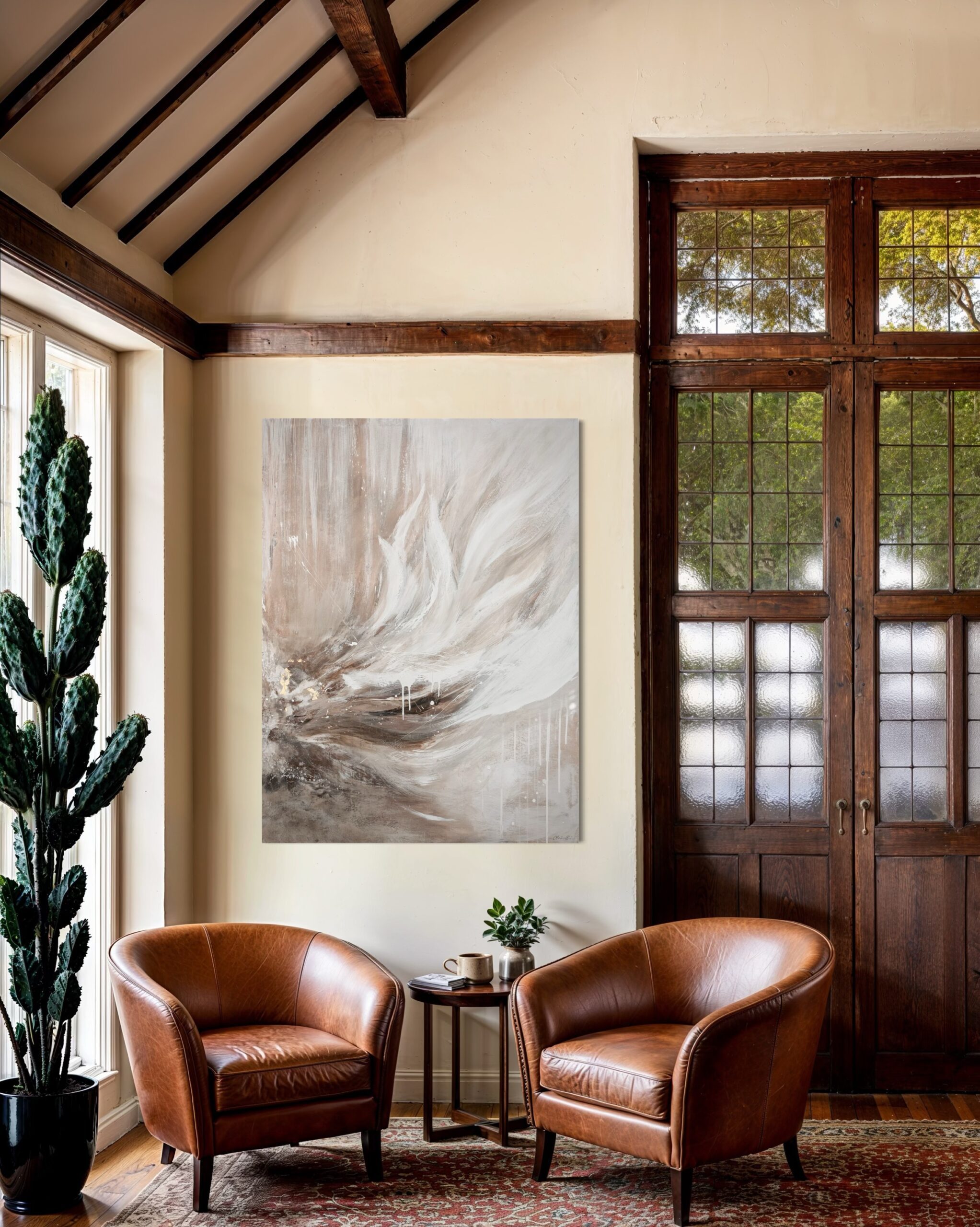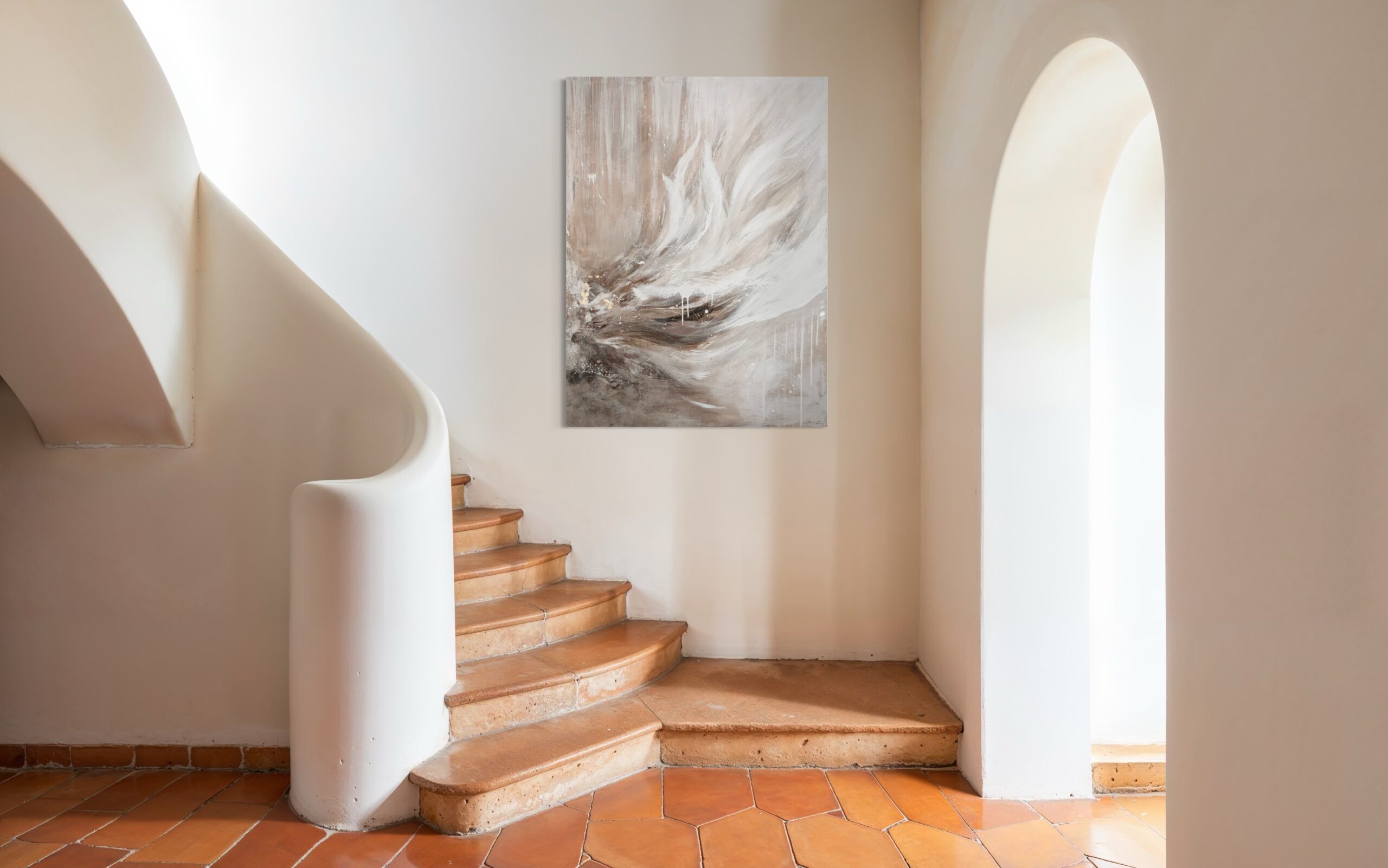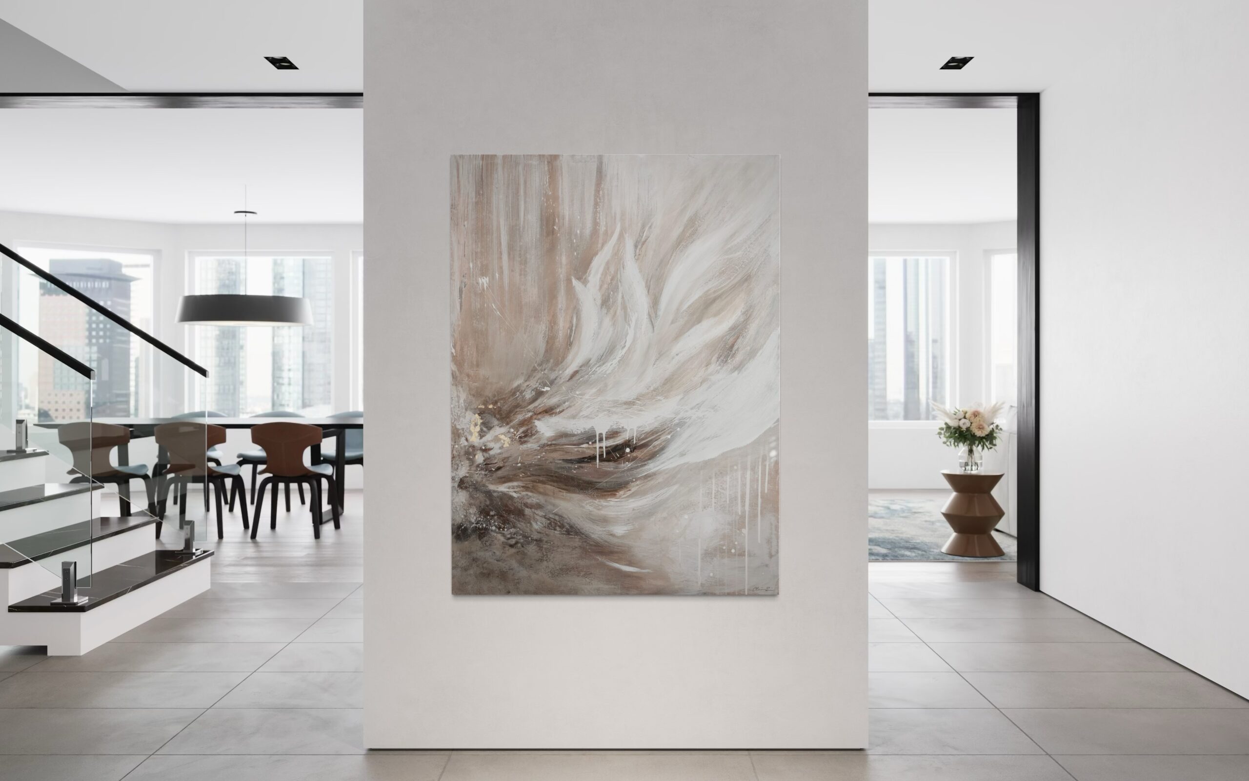 This Angel Collection artwork features soft, protective wings blending into a gentle background, evoking safety and positive energy. The painting comes with a handmade wooden frame in the color oak. It is signed and dated on the back and comes wired and ready to hang. The artwork is coated with an acrylic finishing spray for a long-lasting, scratch-resistant protective surface.