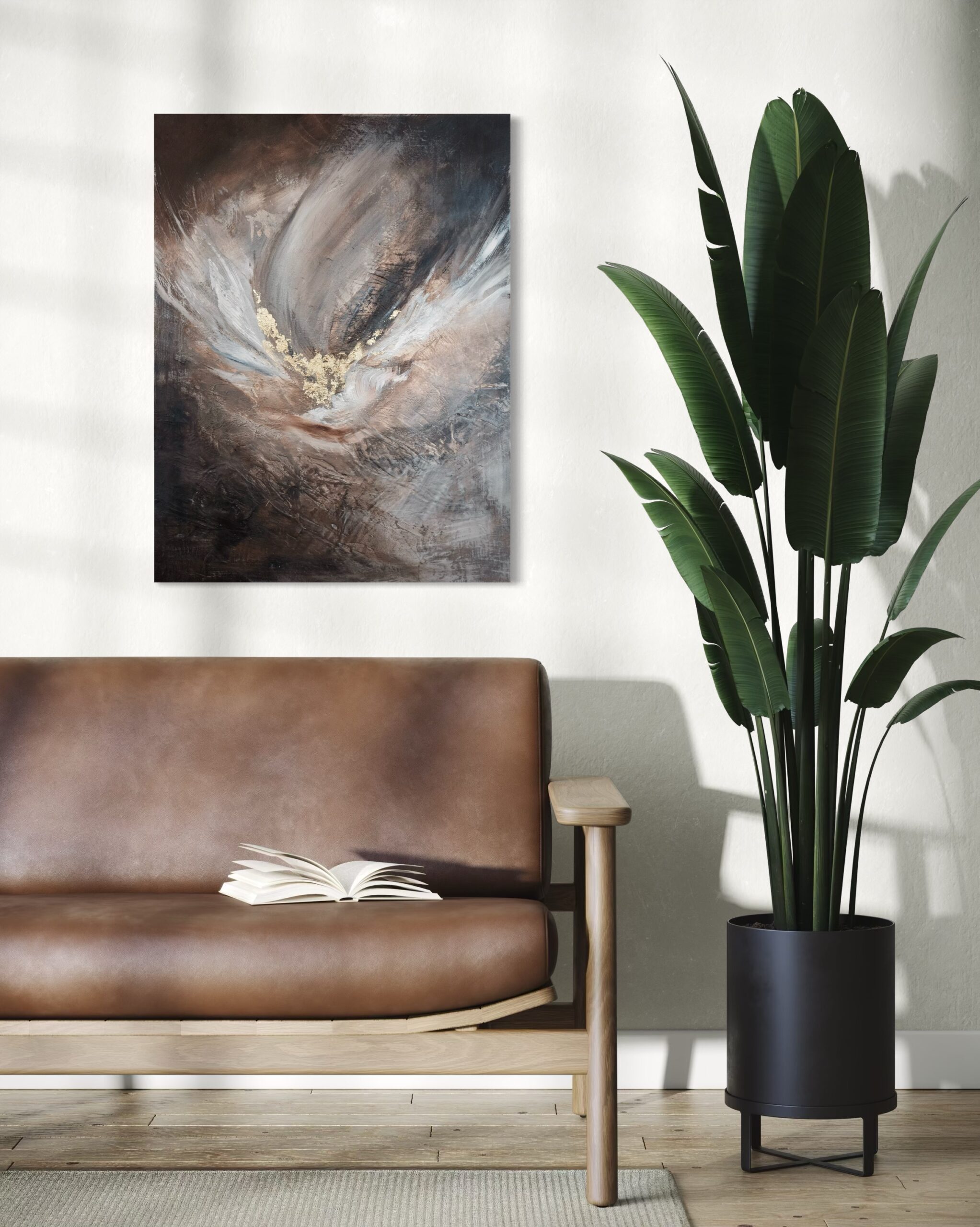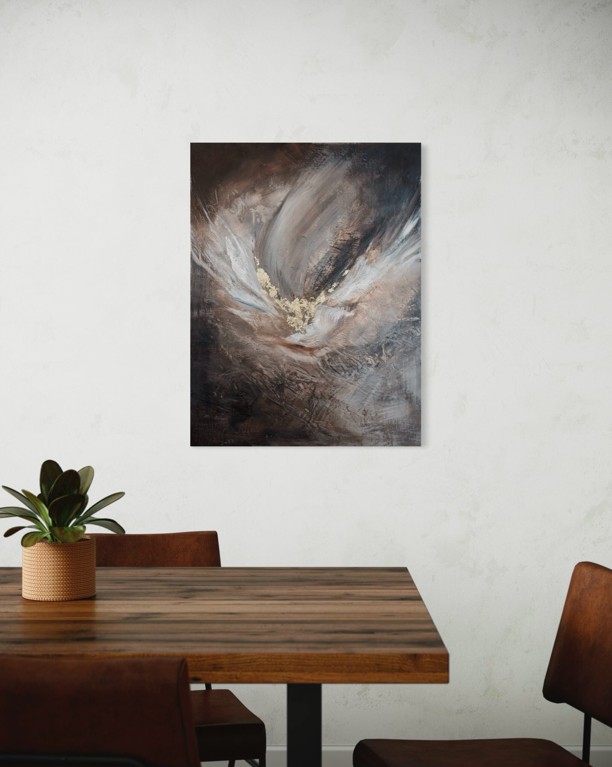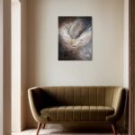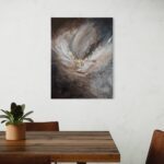 The painting comes with a handmade wooden frame in the color oak. It is signed and dated on the back and comes wired and ready to hang. This darker piece, part of the Angel Collection, captures dynamic movement and the power of bold decisions. The artwork is coated with an acrylic finishing spray for a long-lasting, scratch-resistant protective surface.